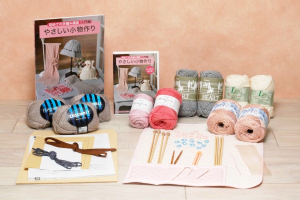 教材セット:●1冊(入門編)●レッスンDVD1枚(全作品のポイント解説)●添削提出用書類・添削提出用封筒●材料セット:小物5作品分の毛糸セット、革ひも、別珍リボン、オーガンジーリボン、カラーゴム
