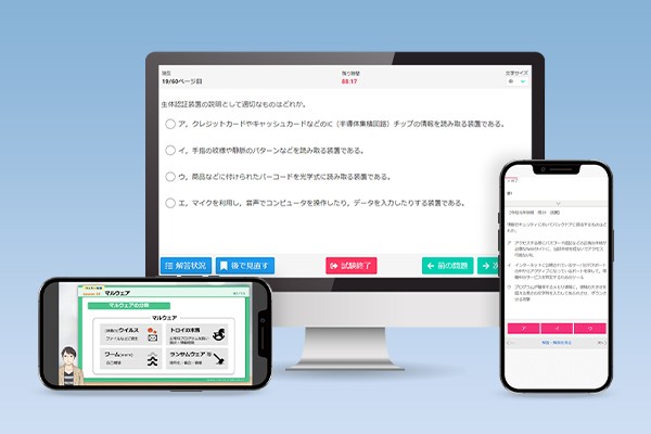 • 独学で合格することも可能ですが、情報セキュリティマネジメント試験は、専門用語の難しさから市販の書籍によるインプットに頼った学習では、理解が進みにくく途中で挫折する人も少なくありません。ユーキャンの情報セキュリティマネジメント講座は、イラストや図解の多い動画講義や手軽にアプトプットできるWEBテストに加えて、オリジナル模擬試験、質問回答などの指導サービスも充実。学習を継続できるよう精一杯サポートしますので、独学での学習に自信がない方でも安心です。