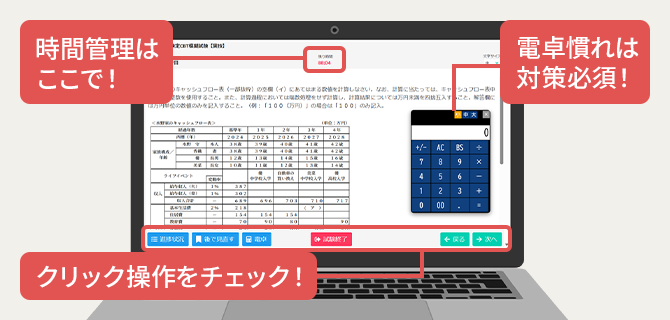 さらに、本番慣れの強い味方となる「CBT模擬試験ありコース」も登場!試験攻略のツボをおさえた予想問題に挑戦できます。本試験と同じ画面で電卓操作など事前にしっかり練習できるので、安心して本試験に臨めます。試験形式への慣れが合格への自信に!
