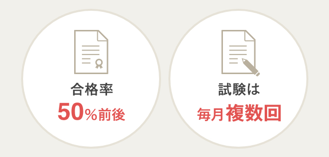 衛生管理者試験は毎月複数回と、他の国家試験と比べて実施回数が多いのが魅力!ご自分のタイミングで受けられます。第一種・第二種とも選択解答式。正答率が各科目ごとに最低4割、全体で6割以上が合格の目安です!満点をとる必要はないので、初めての方でも十分に合格が狙えます。