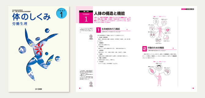労働生理の分野「体のしくみ」を学習。身近なテーマなので取り組みやすく、役立つ知識が身につきます。初学者の方もわかりやすいよう、テキストでは基礎からやさしく解説。覚えにくい項目や間違いやすい項目はイラストを掲載しているので、スムーズに覚えられます。