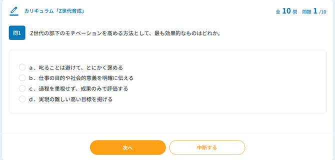 学んだ知識の最終確認としてはもちろん、学習の前後でどれだけ成長したか、事前テストと修了テストの成績を比較することができます。学習後にスキルアップを実感することで、実務に向けてのモチベーションアップにつながります。