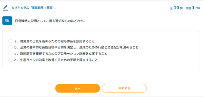 学んだ知識の最終確認としてはもちろん、学習の前後でどれだけ成長したか、事前テストと事後テストの成績を比較することができます。学習後にスキルアップを実感することで、実務に向けてのモチベーションアップにつながります。