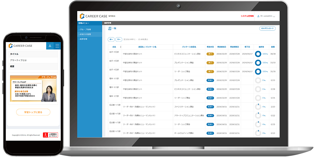 ユーキャンの人材教育サービスをご利用の企業担当者様向けに、一人ひとりの学習進捗状況を確認できる受講進捗状況管理システムを無料でご提供いたします。