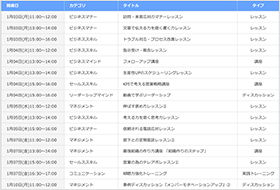 リアルタイム集合型研修は月に40回以上開催されており、研修を受けられる皆様の日程に合わせてご参加いただけます。ビジネス系のテーマを中心に、様々な研修テーマを開催しています。
