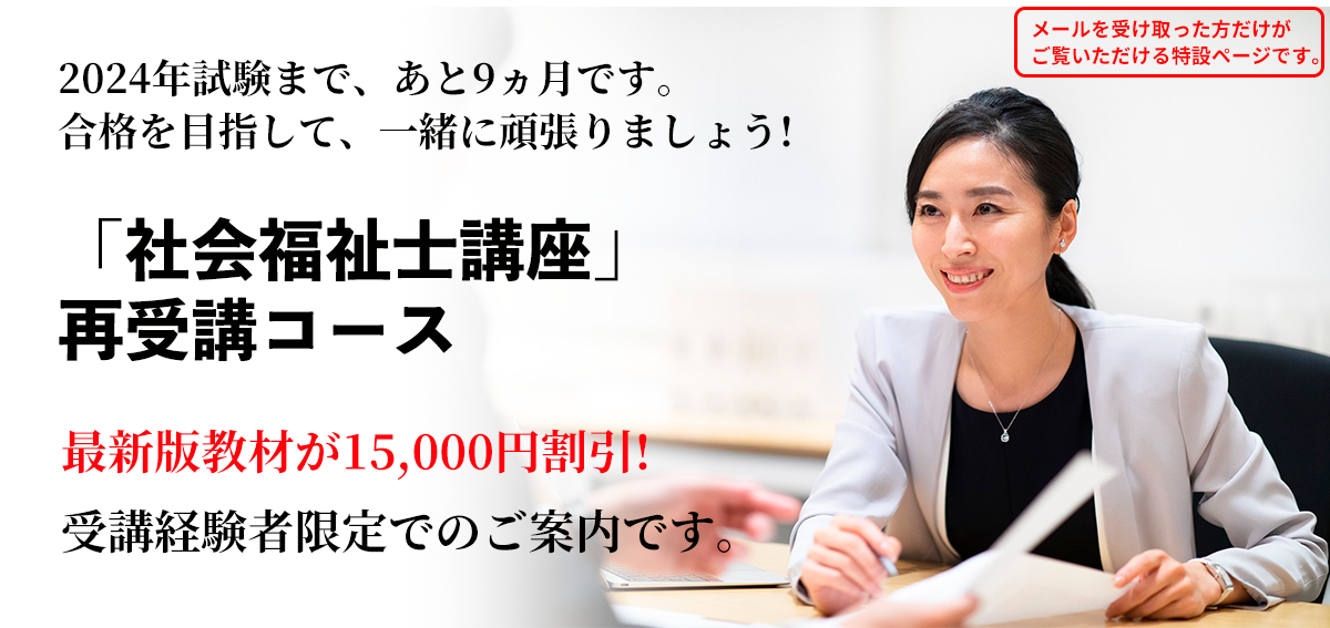 2024年試験向け「社会福祉士講座」を15,000円割引でご受講できる年内最後のチャンスです!